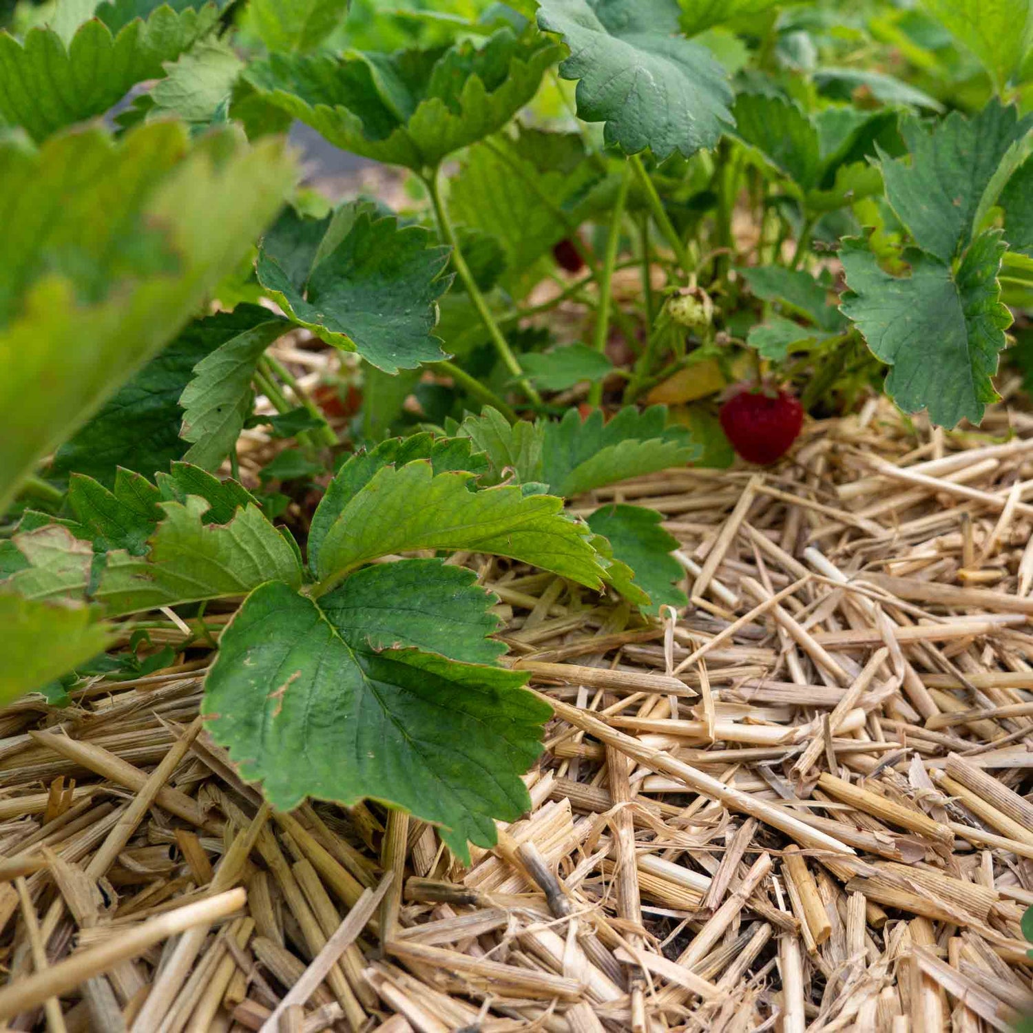 Stroh ist der Klassiker unter den Mulchmaterialien. Es schützt die empfindlichen Beeren vor Feuchtigkeit und unterdrückt gleichzeitig unerwünschtes Beikraut.